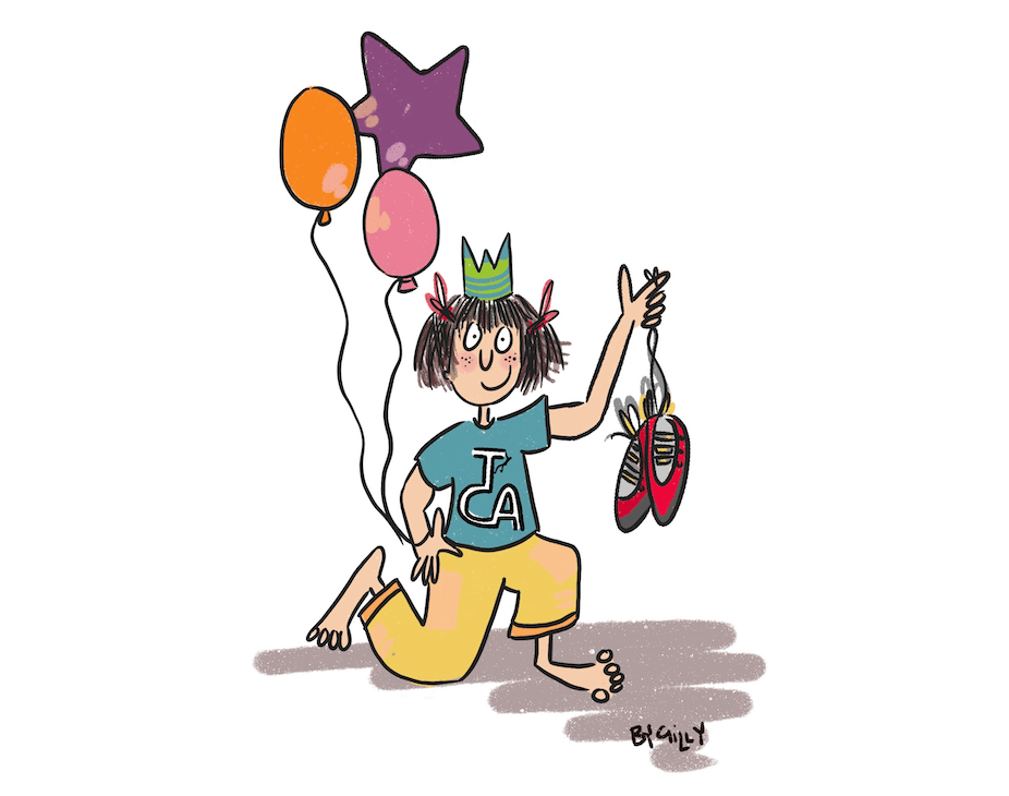 An illustration if a young climber kneeling whilst wearing a party hat, holding up climbing shoes and balloons