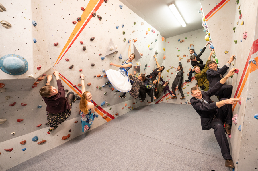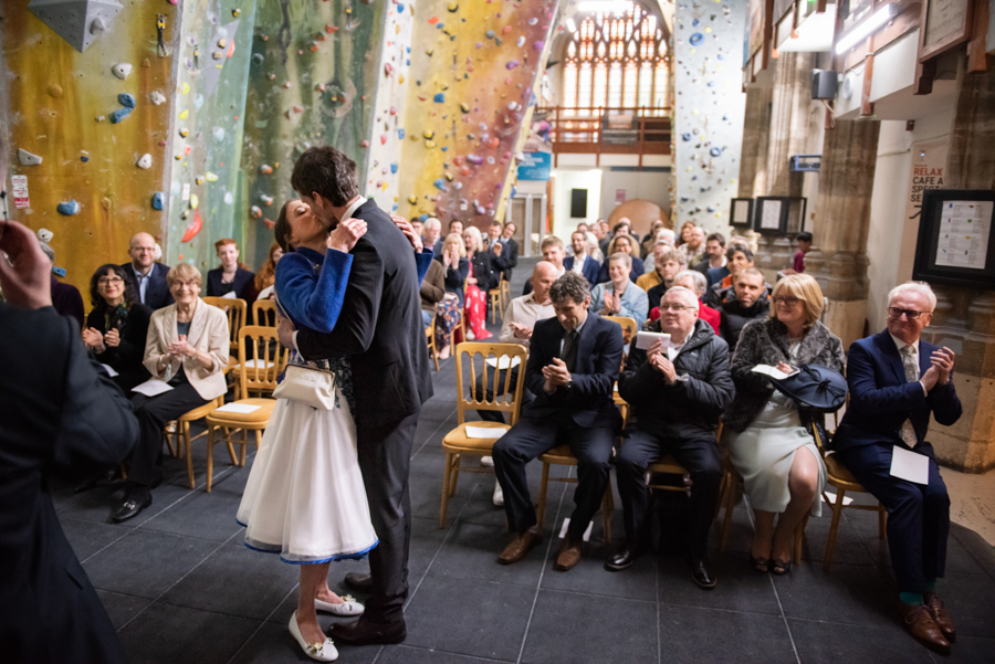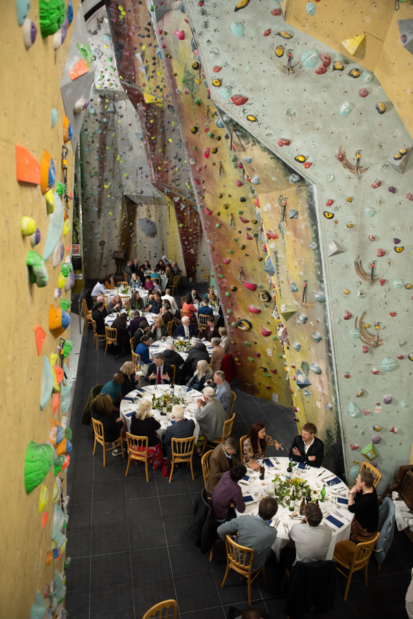 We managed, and the day went smoothly from there, but so quickly that we felt it just flew by! (Non-alcoholic) welcome drinks, wedding service, First Climb, cutting the cake, guest climbing, coffee and cake, more drinks and canapés, followed by a delicious dinner and emotional speeches. Nina and her team ran the bar like professionals, our photographer seemed to be everywhere at once, and through the whole of the event, we felt like the Church itself was taking part in it all; the whole building seemed to radiate with joy about finally being both church and climbing wall at once, its two identities reunited in perfect harmony. We certainly had the time of our life that day, and we would like to thank everyone at TCA for working so hard to make it work out so perfectly.