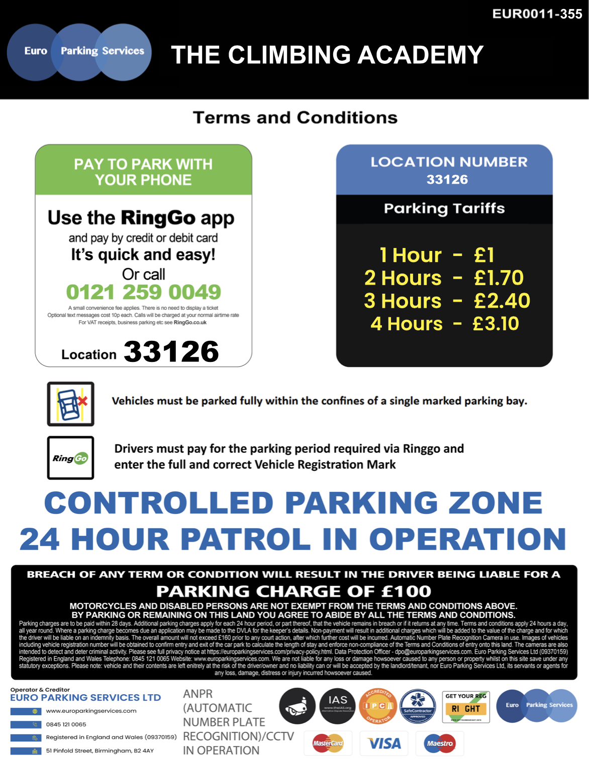 The car park is managed and operated by Euro Parking Services, with ANPR (Automatic Number Plate Recognition) and CCTV in operation. Full T&Cs and charges are displayed on site and below.